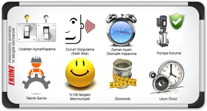 EKONT CSK 3001 GSM Uzaktan Kumanda Cihazı ile elektrikli cihazlarınızı sulama pompalarınızı uzaktan açıp kapatabilir, çalışıp çalışmadığını öğrenebilirsiniz. Dilerseniz çalışma süresini 9.999 dakikaya kadar telefonunuzla arayarak programlayabilirsiniz. Giriş kontaklarına bağlayacağınız cihazların durumu değiştiğinde (örneğin termik attığında veya pompa arıza durumuna geçtiğinde) yetkili kişiye SMS ile bilgilendirme yapabilirsiniz.